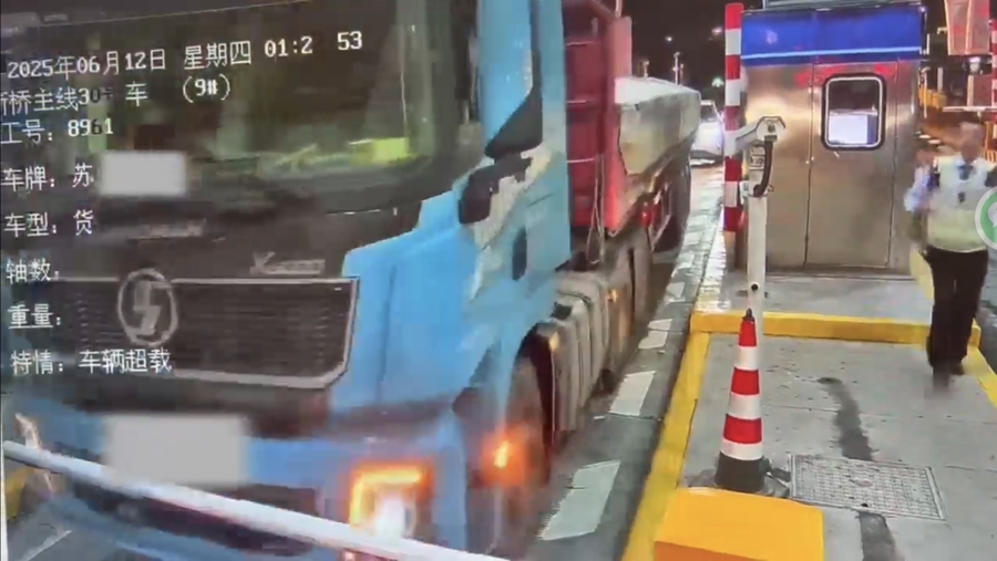 就在这里,收费员发现这辆大货车严重超载,不能进高速,明确表示要等候处理。