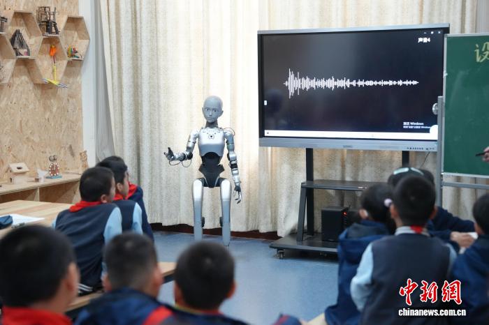 10月27日,全尺寸仿生教育机器人“小安老师”在合肥一所小学为学生授课。中新社记者 张俊 摄