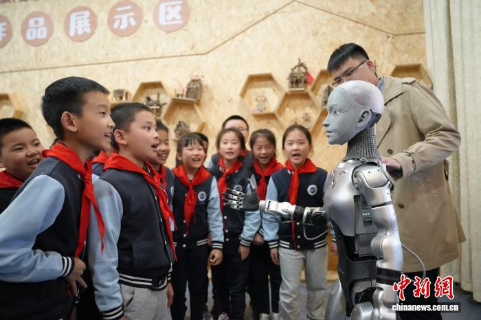 10月27日,学生与全尺寸仿生教育机器人“小安老师”互动。中新社记者 张俊 摄