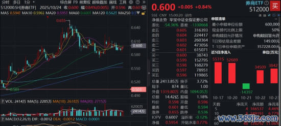热门ETF方面,386亿规模券商ETF(512000)早盘冲高,场内价格一度涨逾1%,后震荡回落,尾盘再度发力,收涨0.84%向上触及60日线,全天成交额14.42亿元,环比放量。